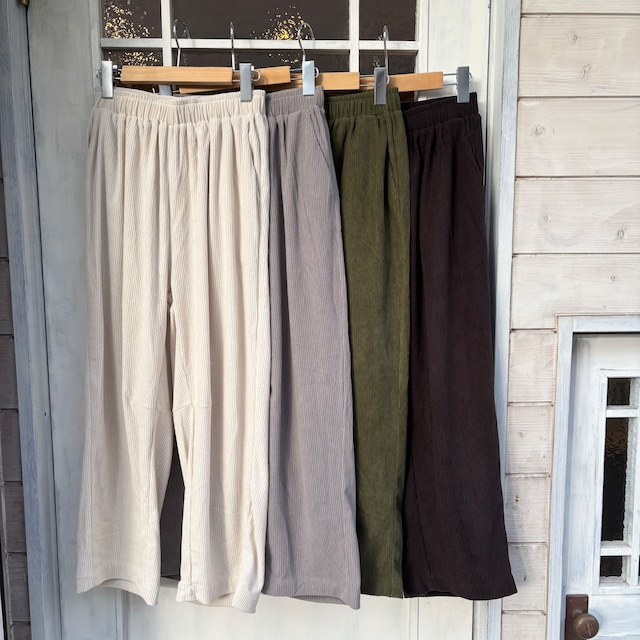 季節感が高まる微起毛のコール天素材のパンツです。 肌に触れる内側はさらっとなめらかな質感で、ゆったり穿けるウエスト総ゴムになります。 素材 ポリエステル 70% 綿 30% サイズ 丈 91cm 股下 55cm ウエスト 68cm〜