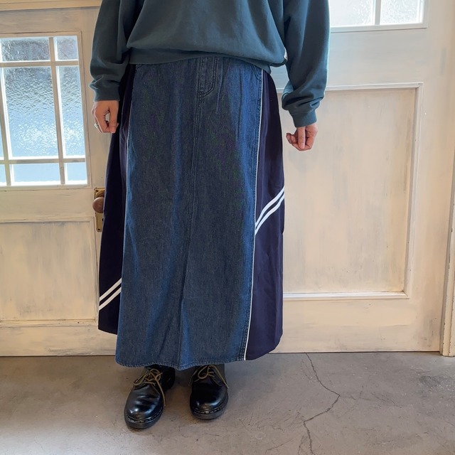 \ジャージ×デニム!他にないデザインスカート/ ●ジャージとデニムの切替が他にない、ロング丈のフレアスカート。 ●ロング丈でウエストゴム仕様。幅広い体型の方にご着用頂けます。 素材 綿 100% (ジャージ生地 ) レーヨン 62% ナイロン 33% ポリウレタン 5% サイズ ウエスト:68〜102 cm ヒップ:122 cm スカート丈:92 cm 裾幅:97 cm