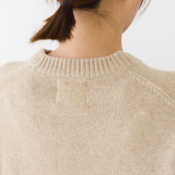 ラムウールの光沢を活かしたクルーネック。袖口と裾の配色切替とスリットで、今年らしい上品なデザインです。