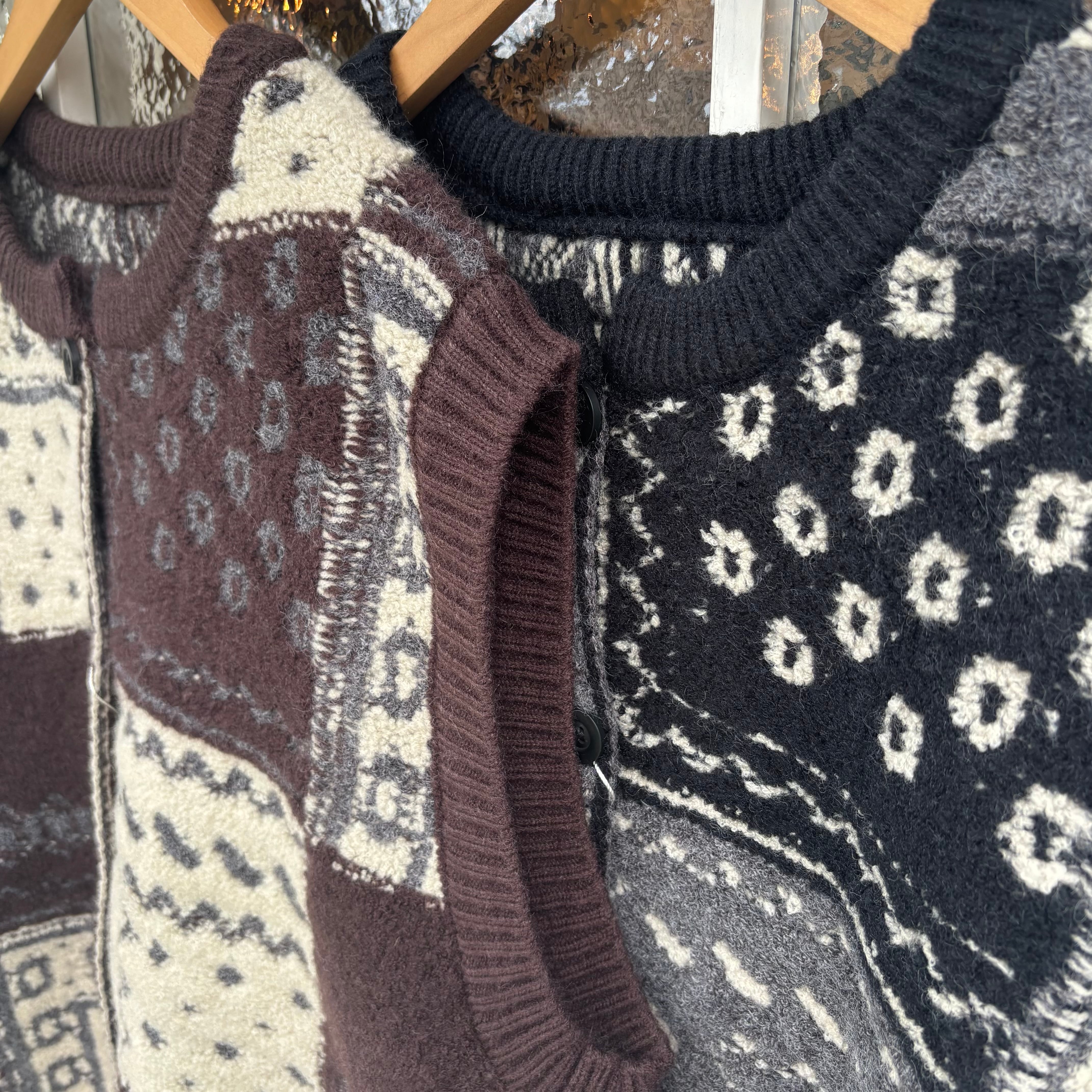 パッチワークのように四角く区切られた配色がユニークなニットベスト。横に張り出した前後の身頃が体のラインをカバーし、腕や肩まわりをすっきりと見せてくれます。普段の何気ない装いにプラスするだけで、華やかなレイヤードスタイルが完成するアイテムです。