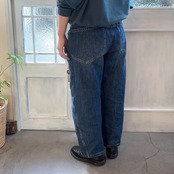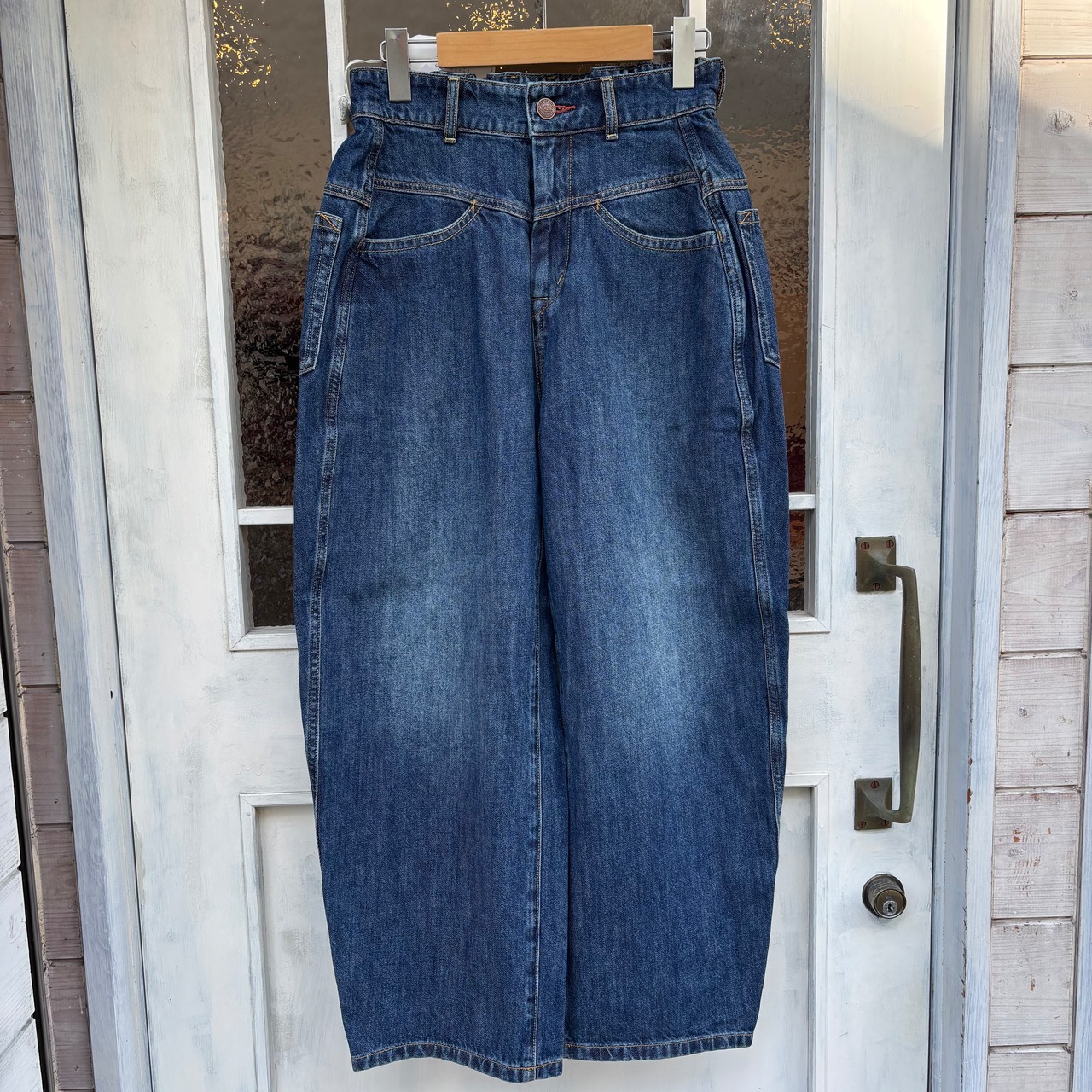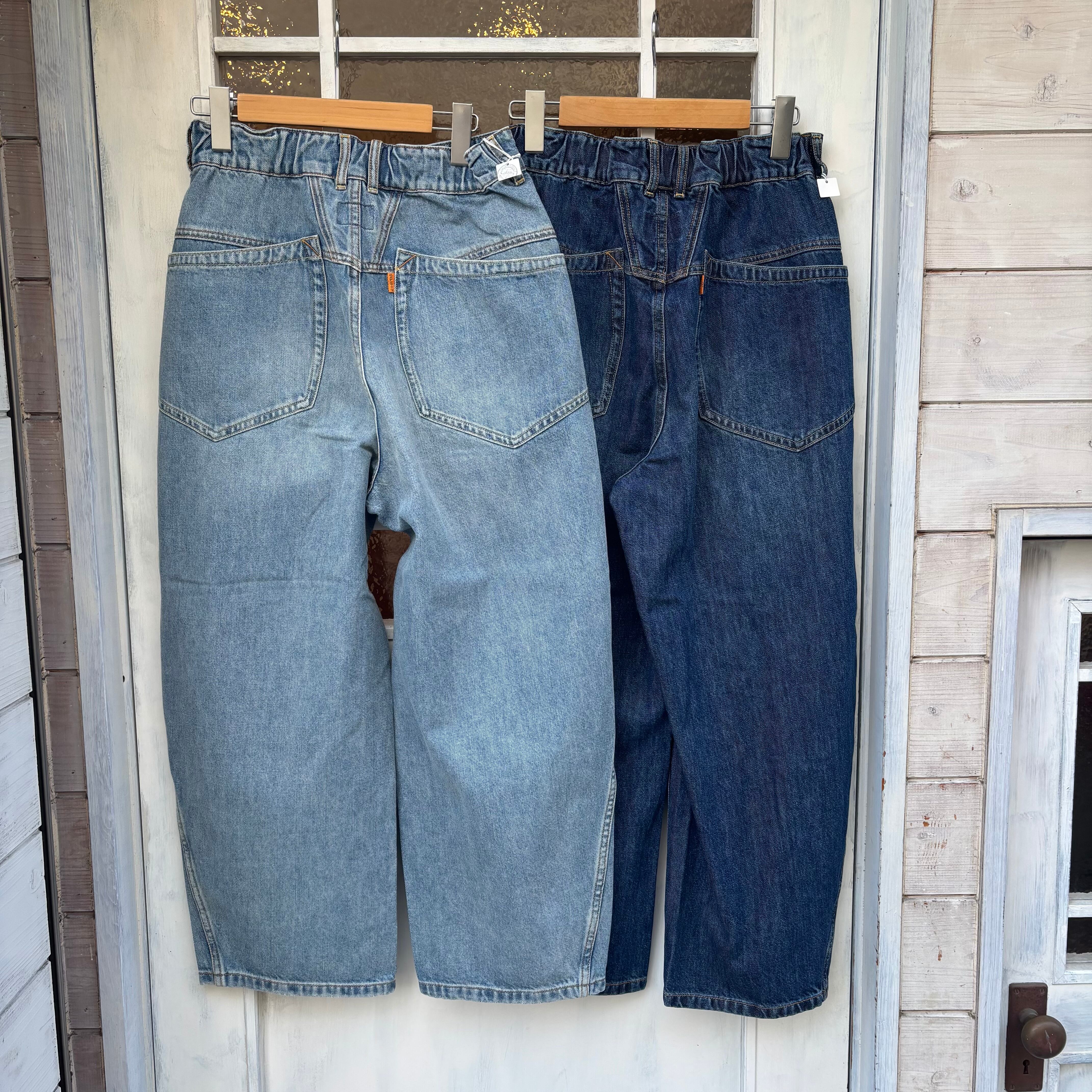 あえて古着のような色合いに仕上げた綿100%デニム素材は、はき込んで揉み込まれたような硬すぎない風合いにもこだわり、全体的にたっぷりとした分量感ながら、キュートな脇の丸みとカーブラインで絞った裾で計算された人気のコクーンシルエット。