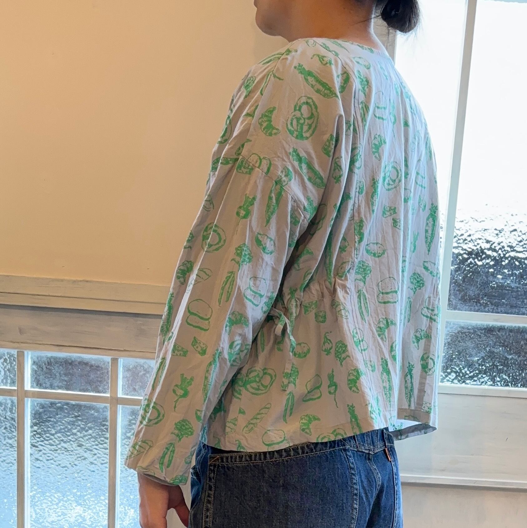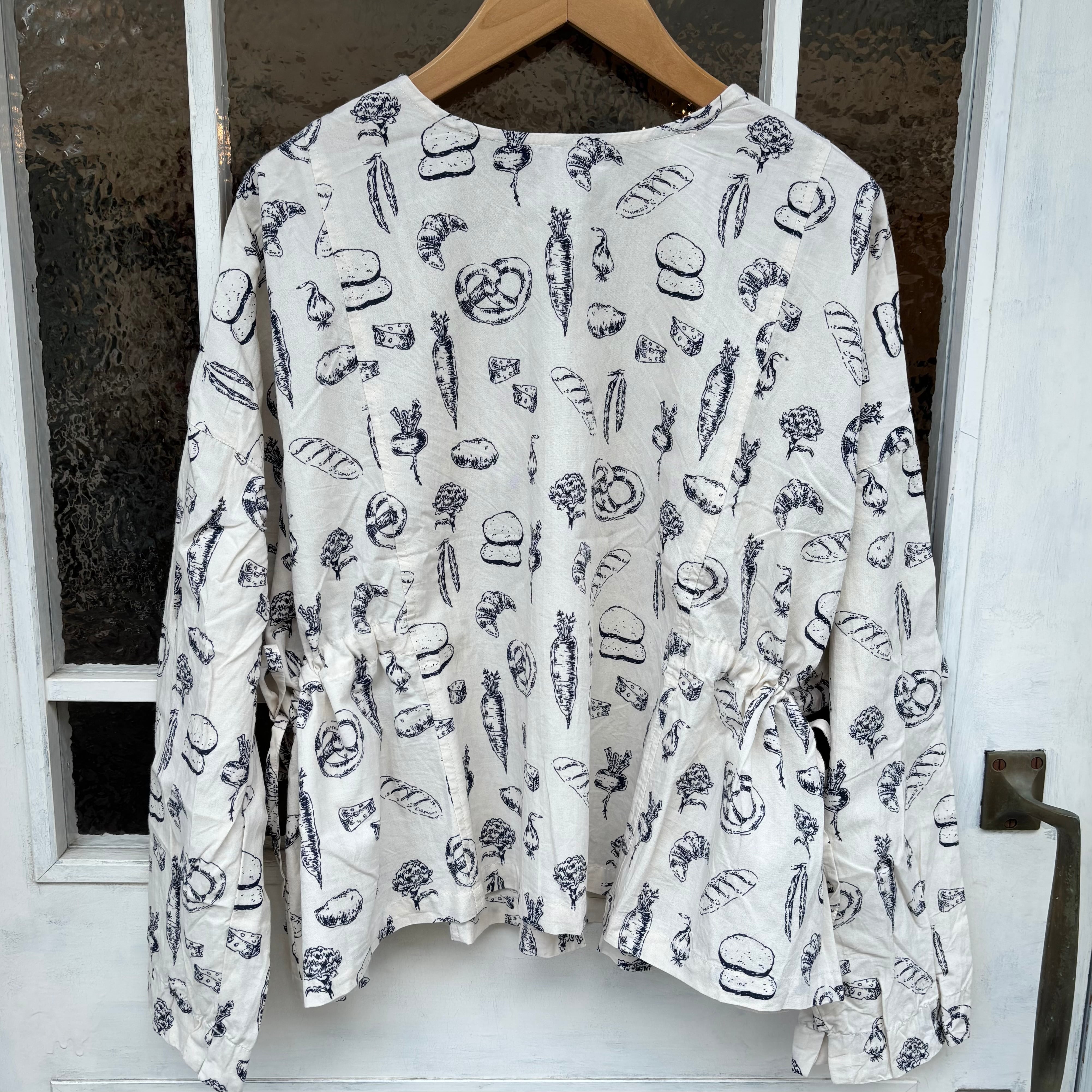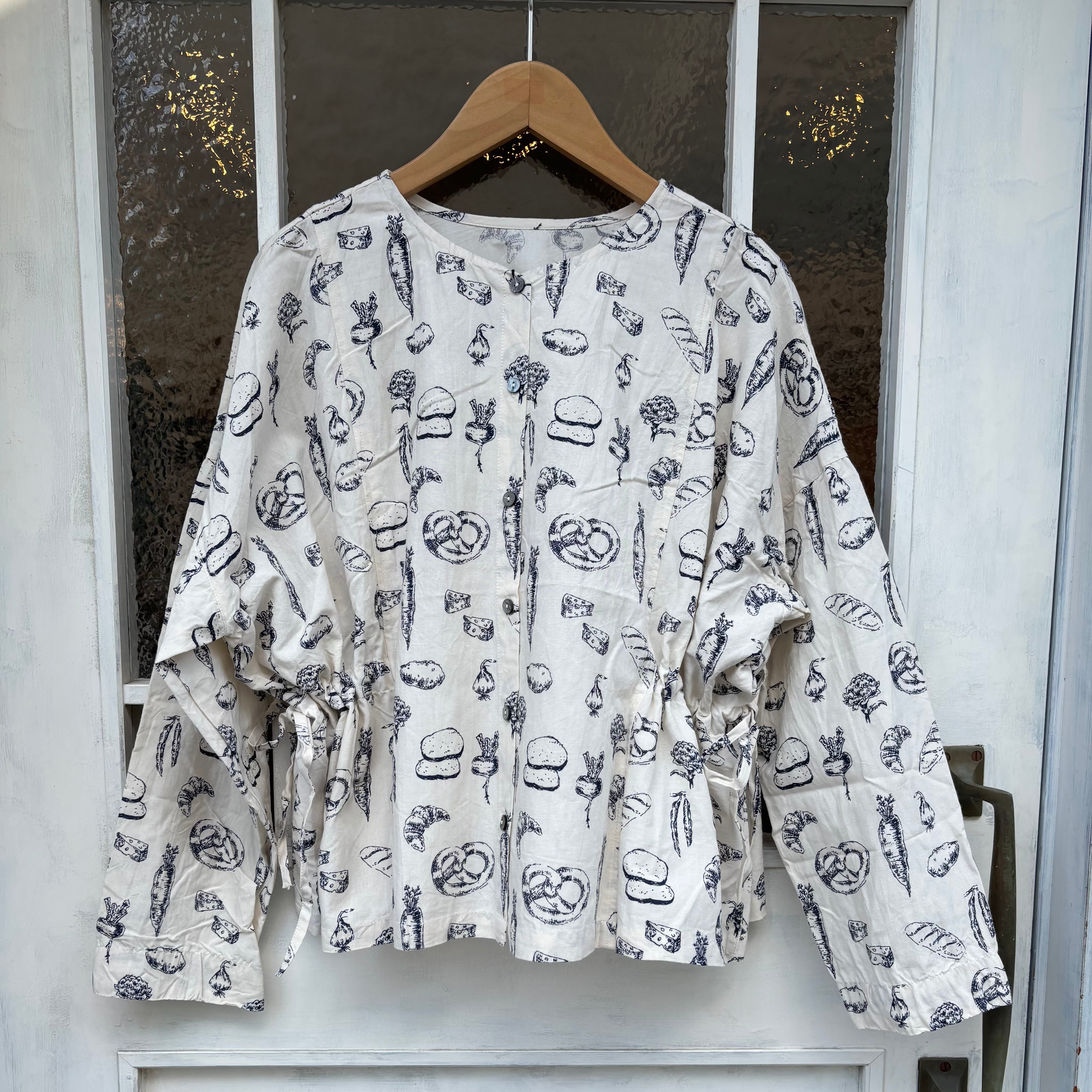 野菜とパンの線画プリントの2wayブラウスです。