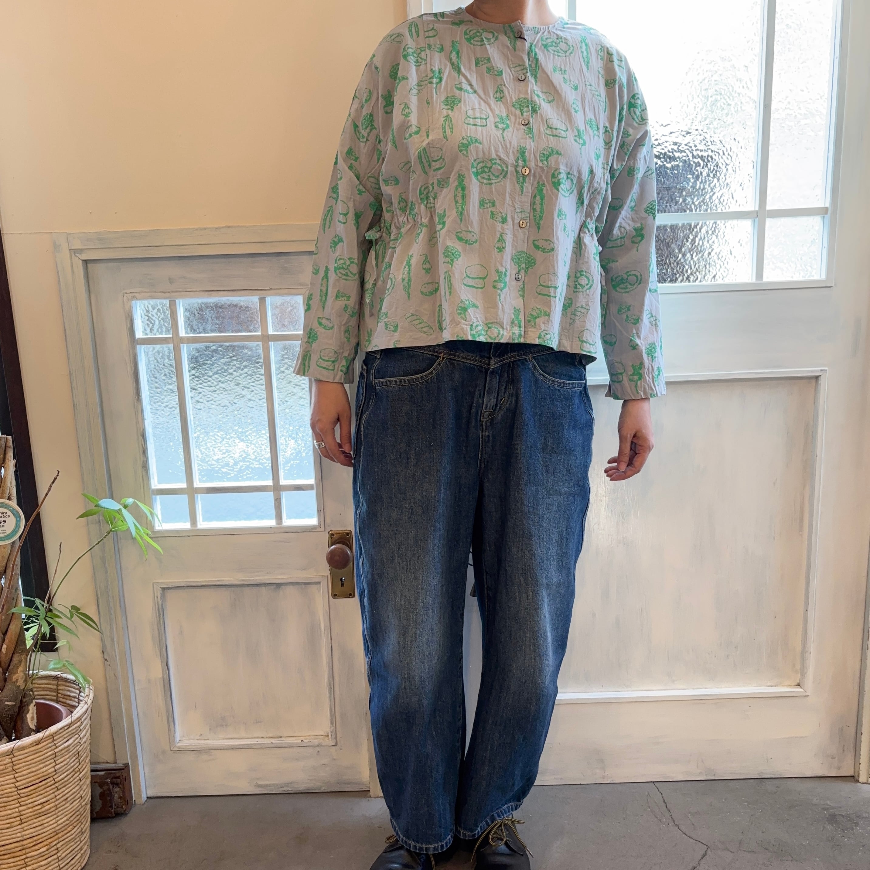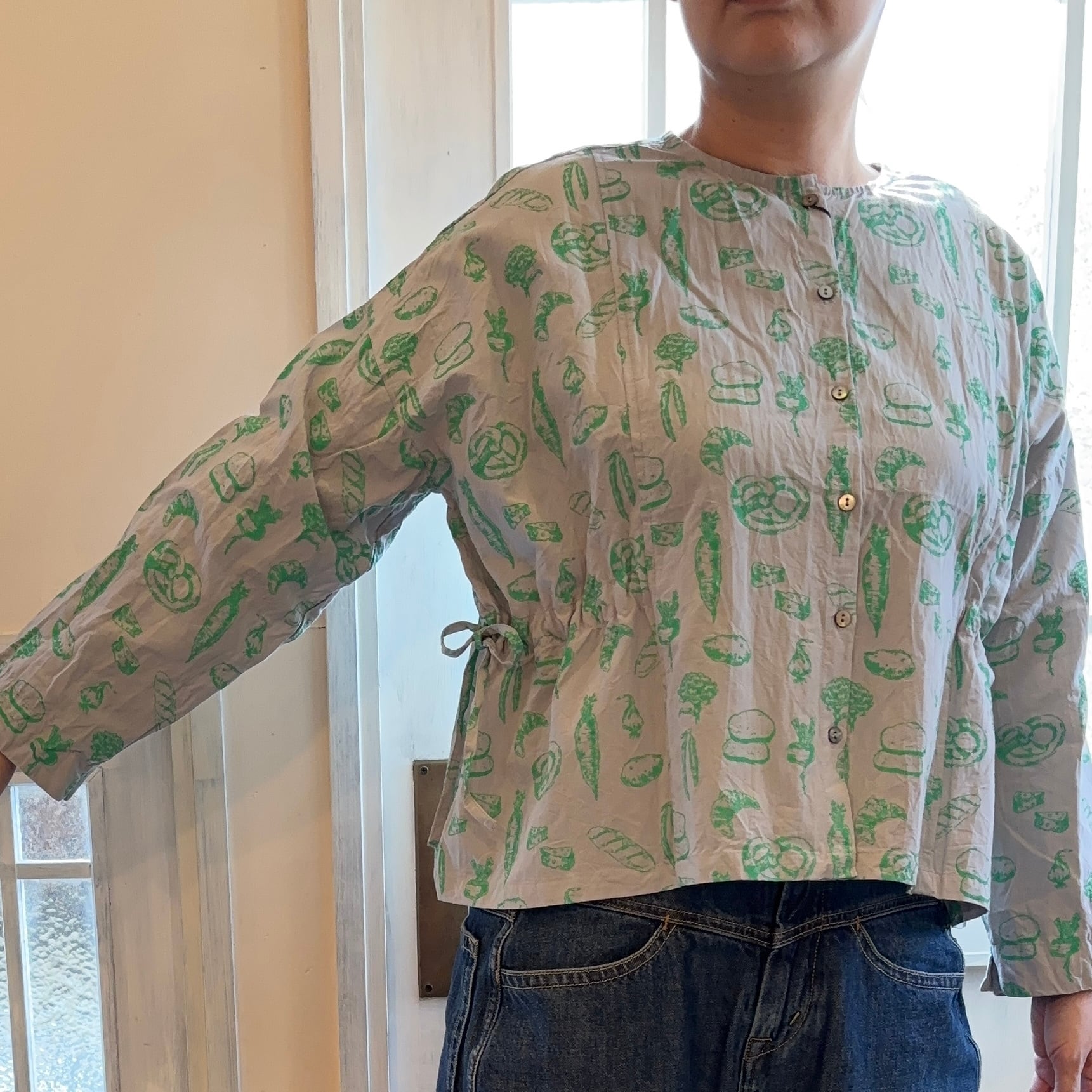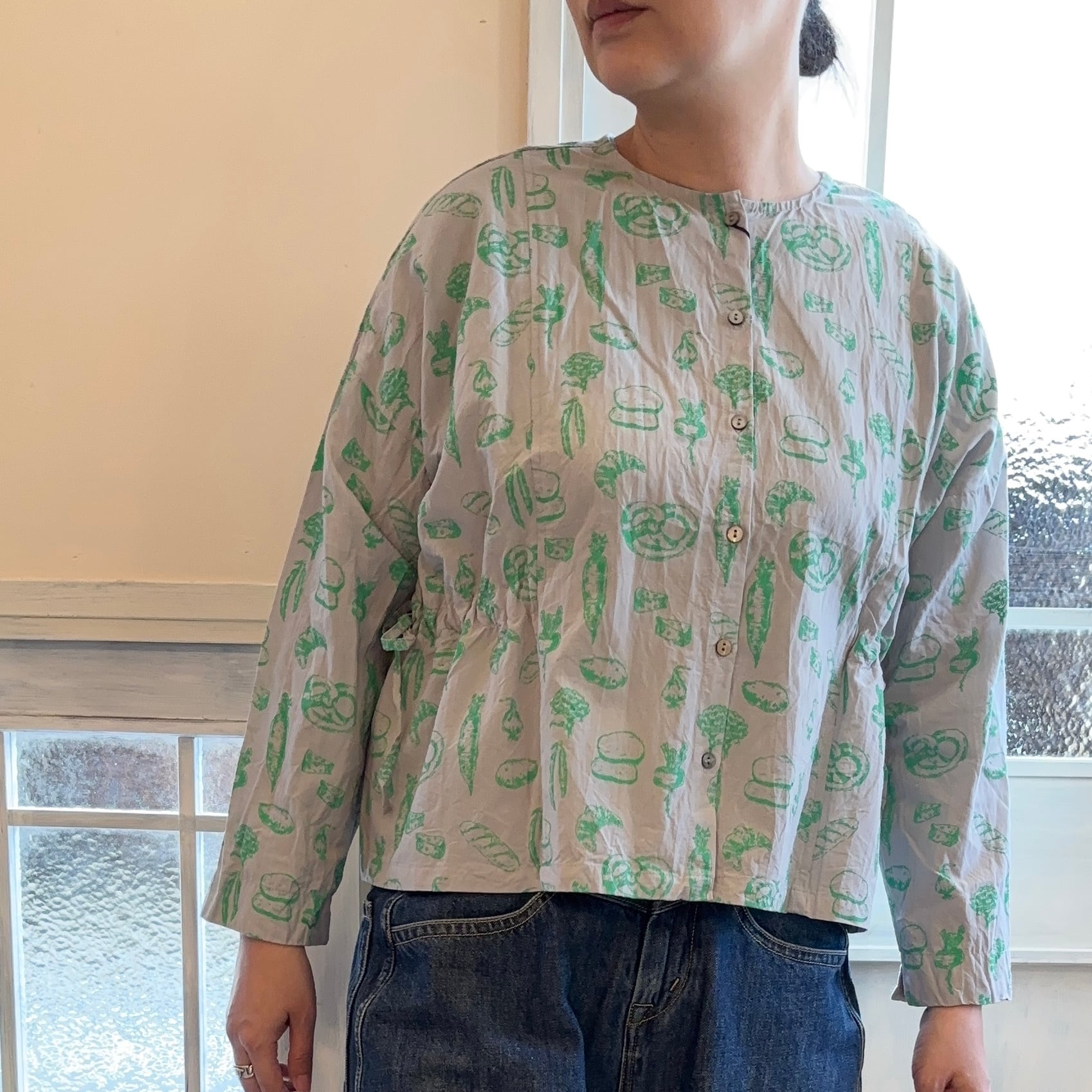 野菜とパンの線画プリントの2wayブラウスです。
