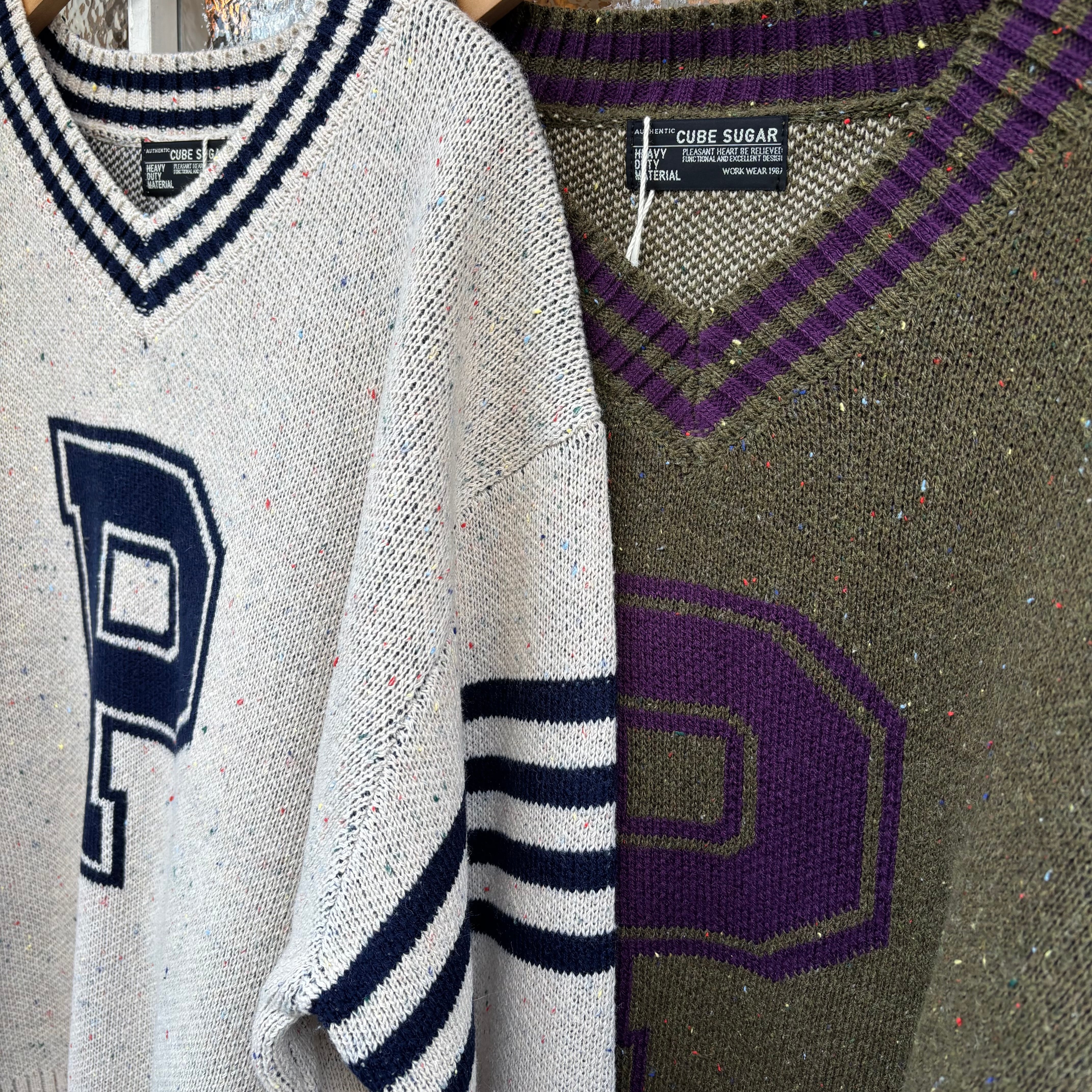 ネップヤーン ニット ジャガード peanuts ライン入り Vネック プルオーバー 《CUBESUGAR》キューブシュガー