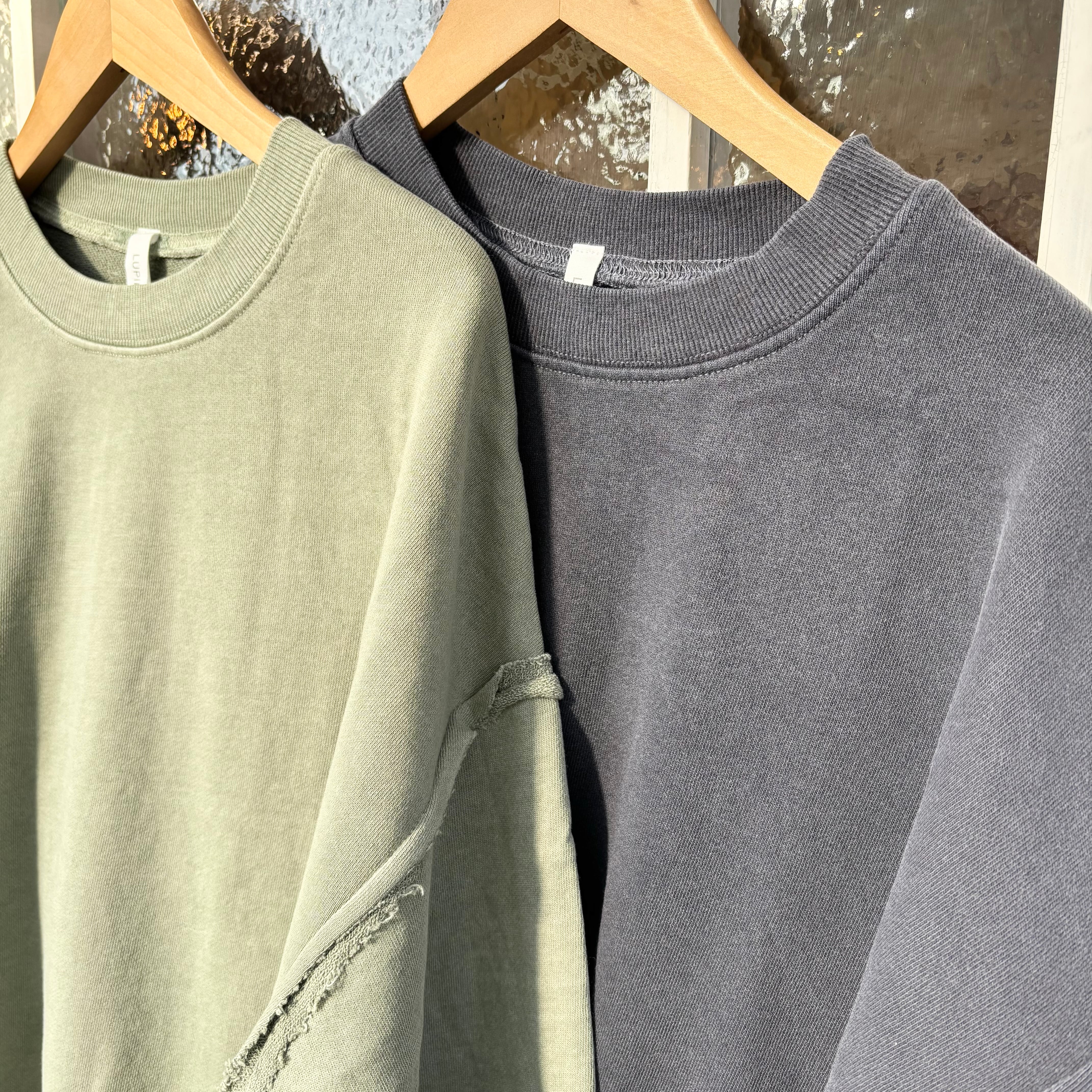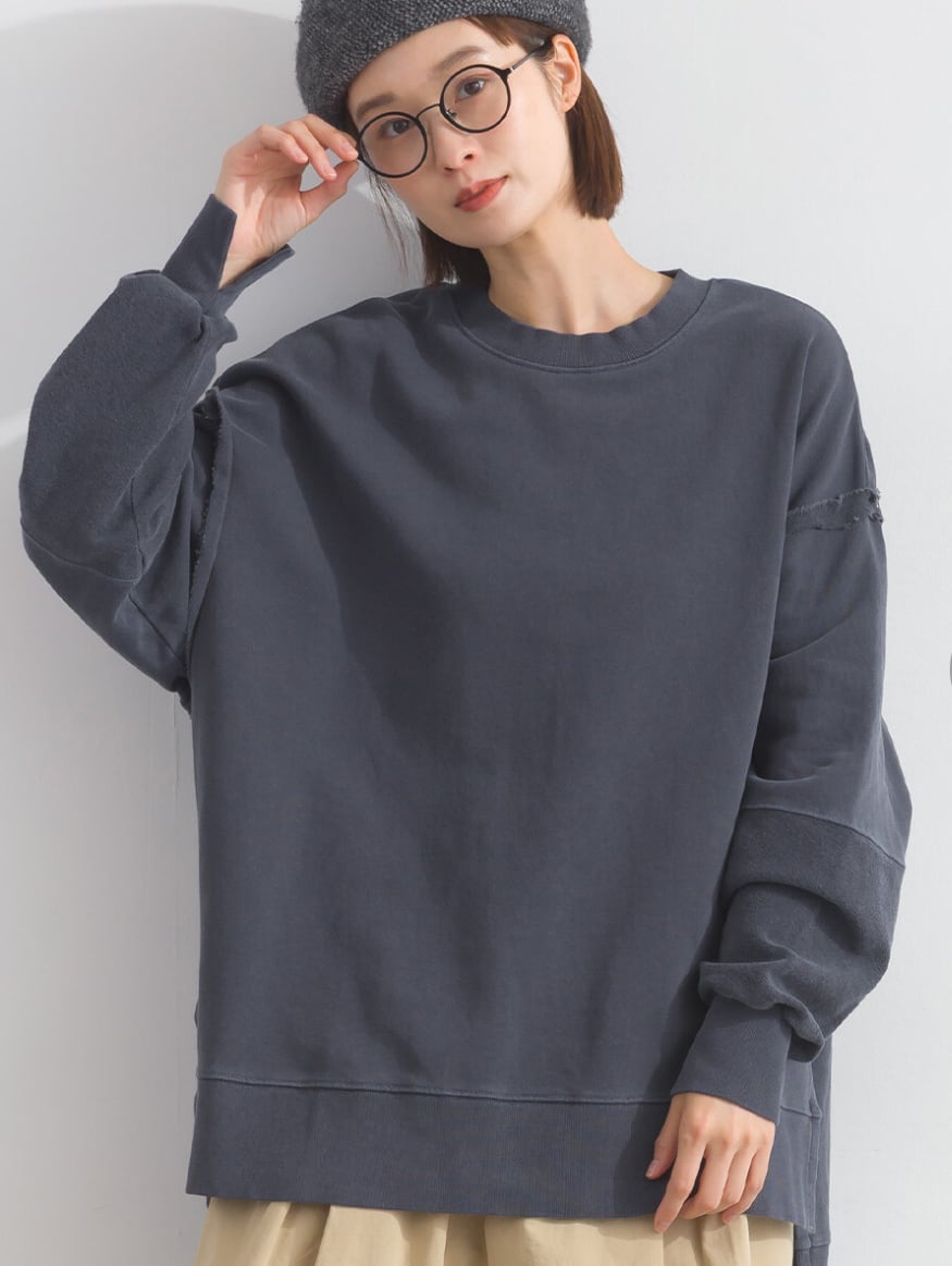 ピグメント加工によるユーズド感のある風合いが魅力です。肩口のラインと袖先の切り替え部分は裏面の素材を使用して表情に変化をし、ユーズド感や切り替え部分がこなれ感を演出しています。
