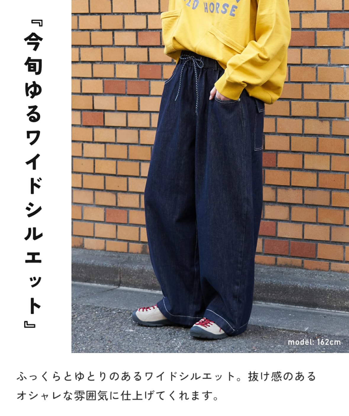 ゆったりとしたワイドシルエットで、気負わず穿けるデニムパンツ。らくちんな穿き心地を叶えつつ、すとんと落ちるラインが大人っぽい印象に。