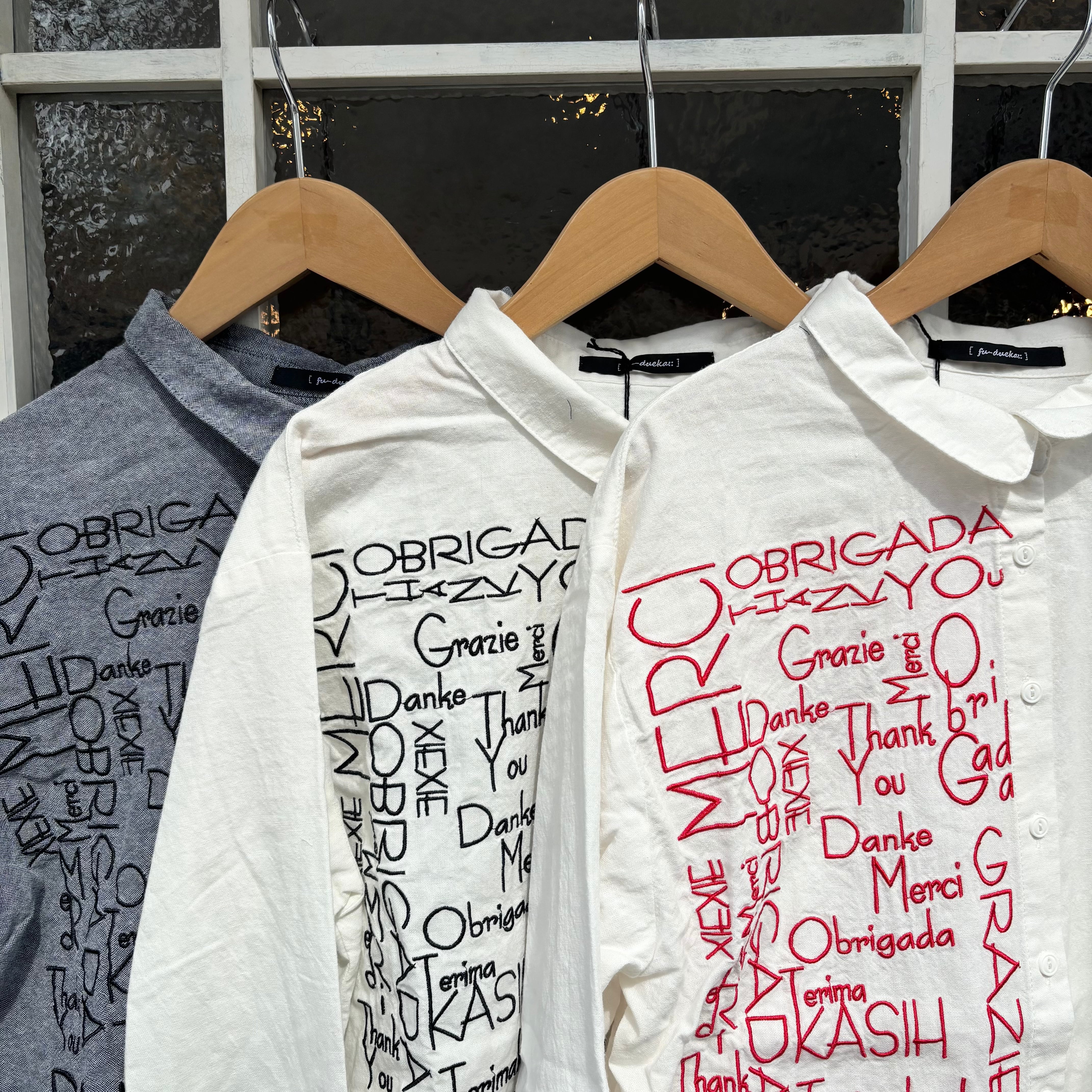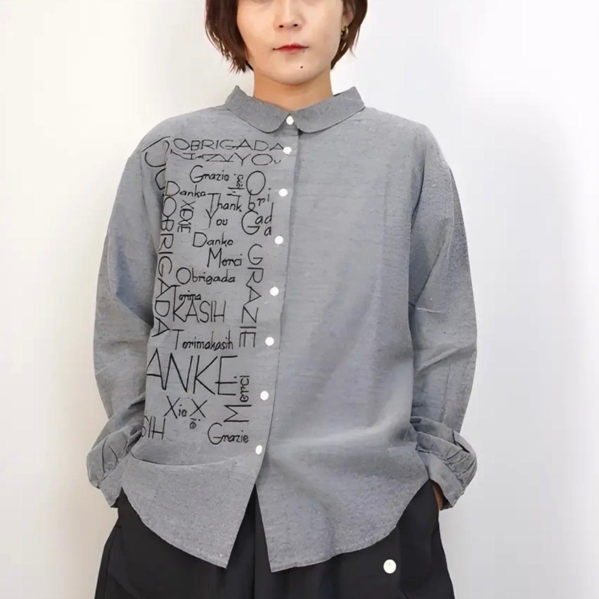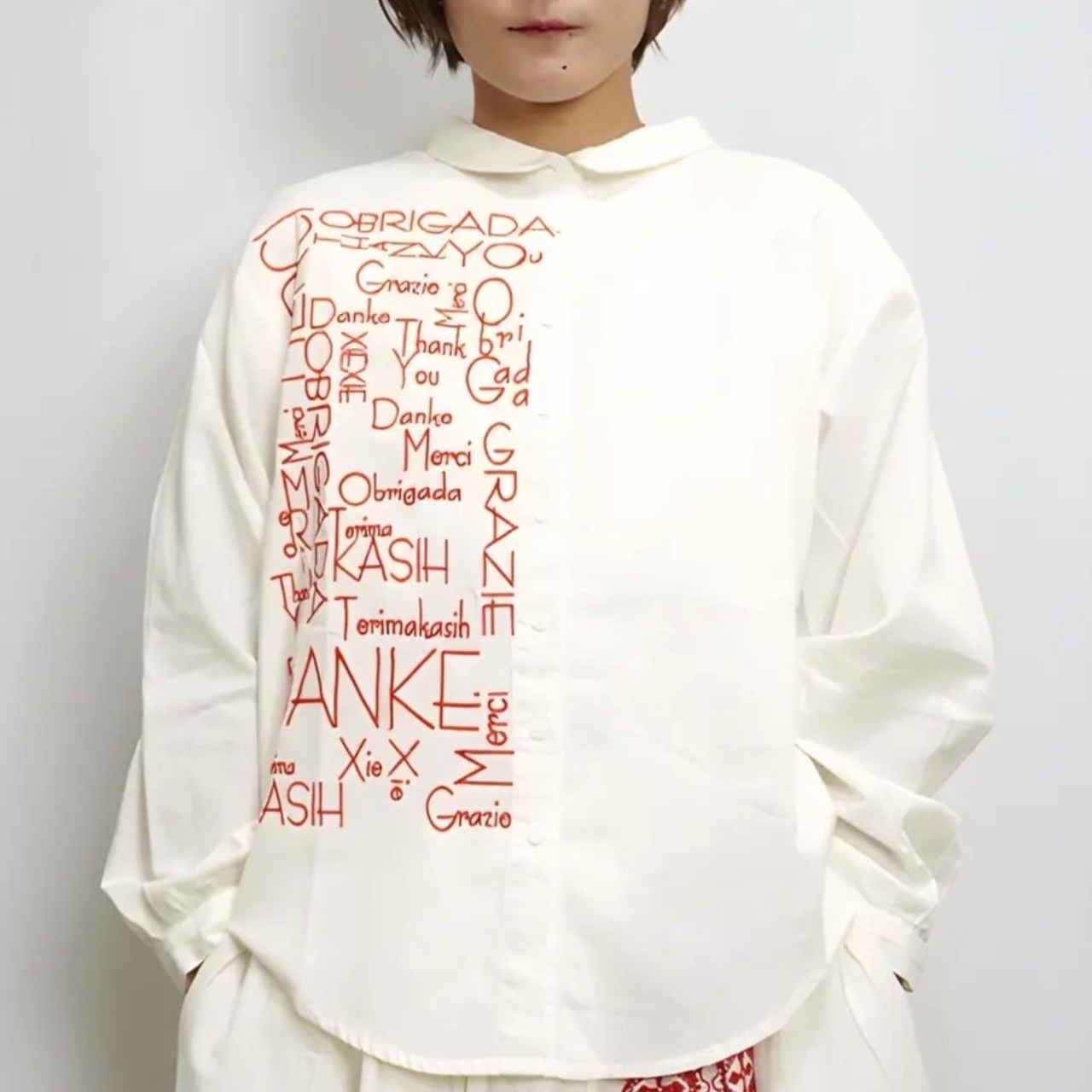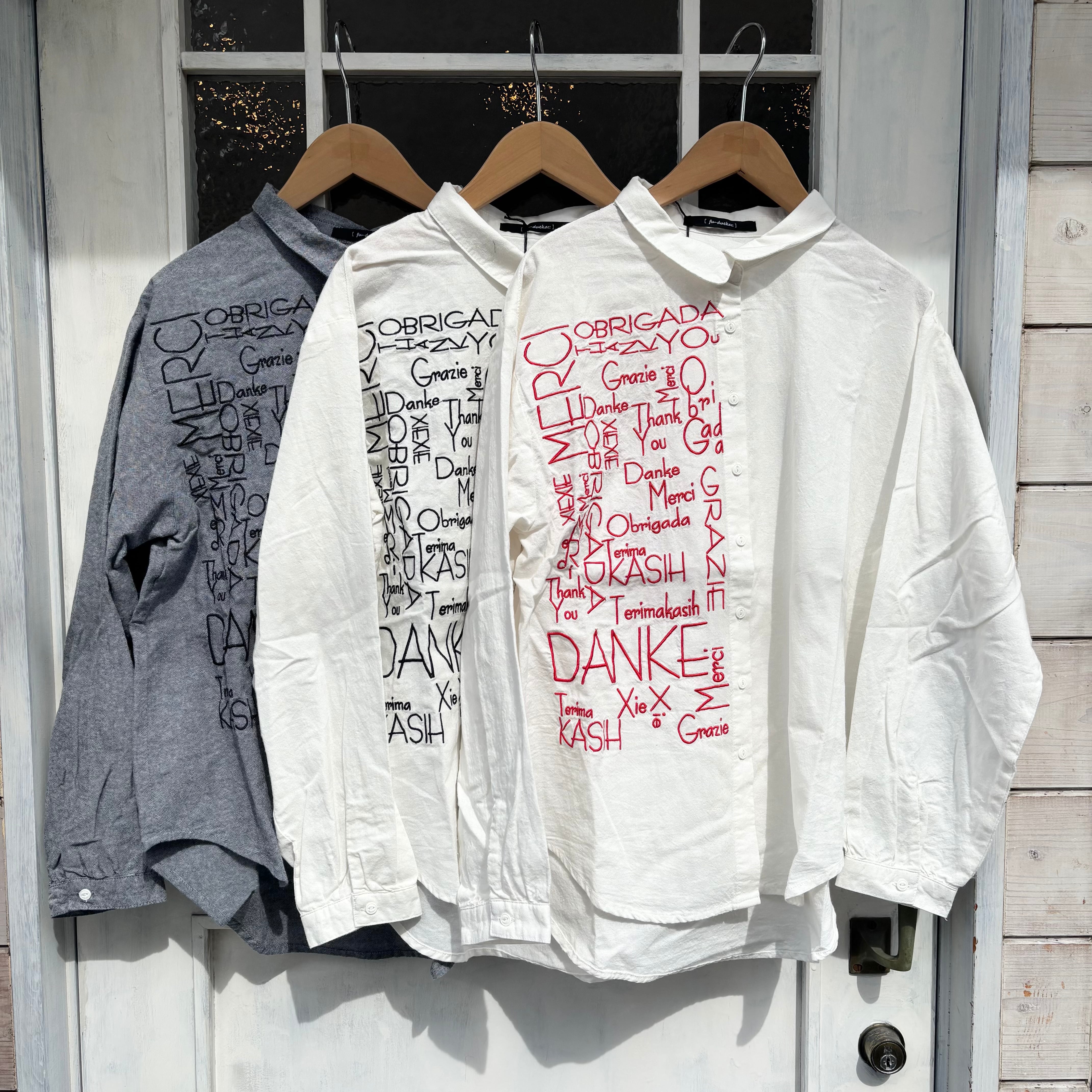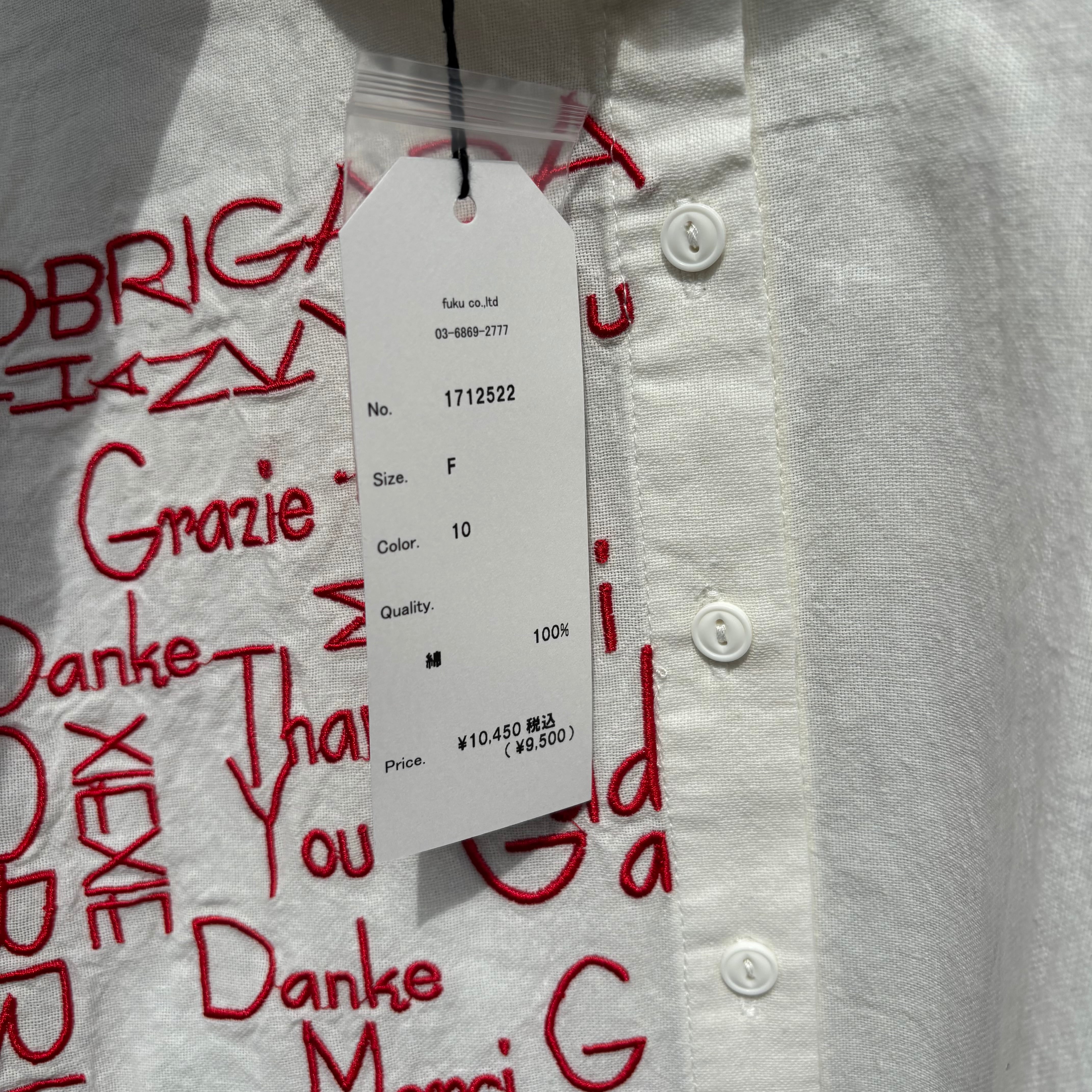 右身頃のみにほどこした、たくさんの「ありがとう」の刺しゅうメッセージが、インパクト抜群な一枚。シャツのきちんと感を残しながらもキャッチーなデザインで着こなしのメインになります。ちょこんとついた丸襟やラウンドヘムなどディテールに女性らしさを。