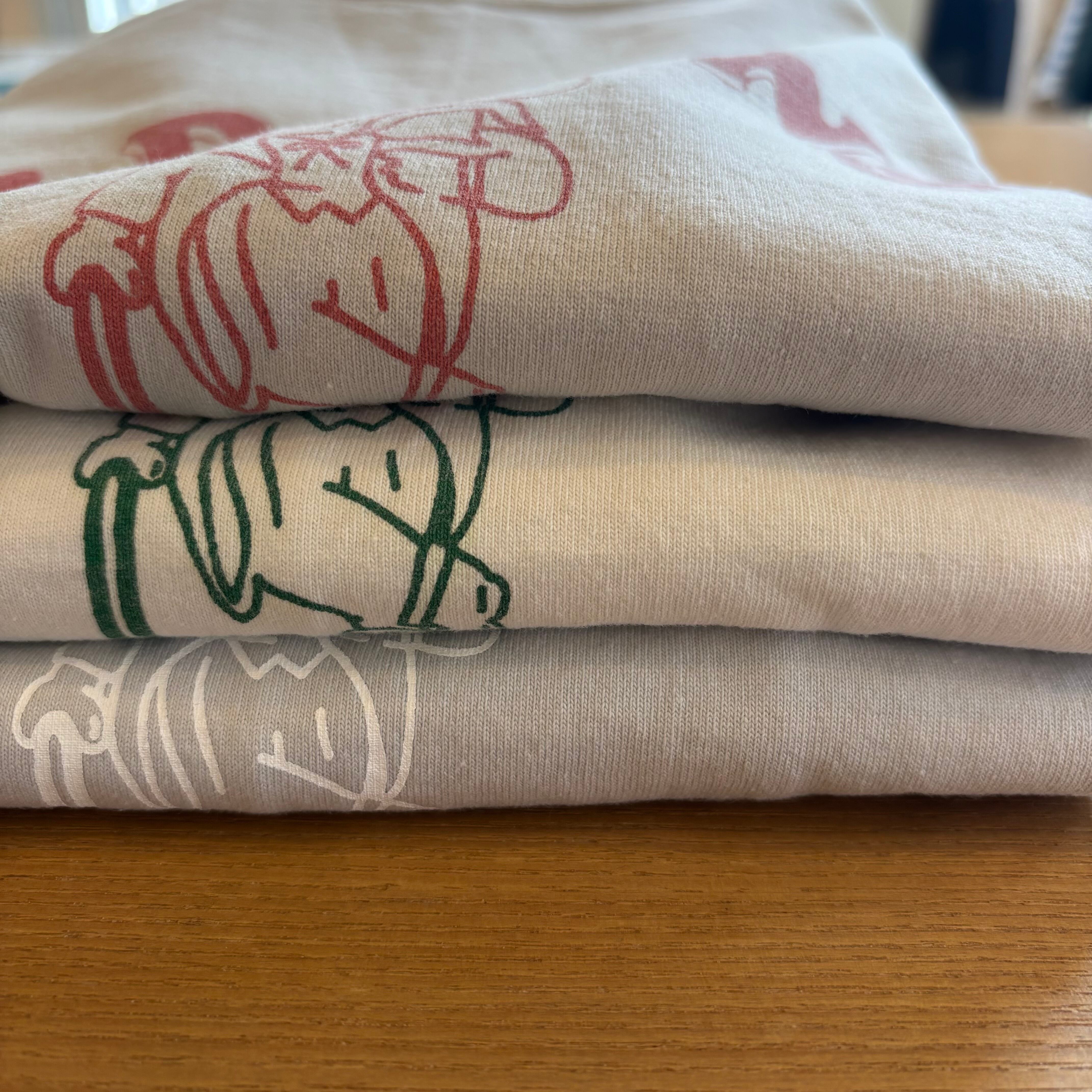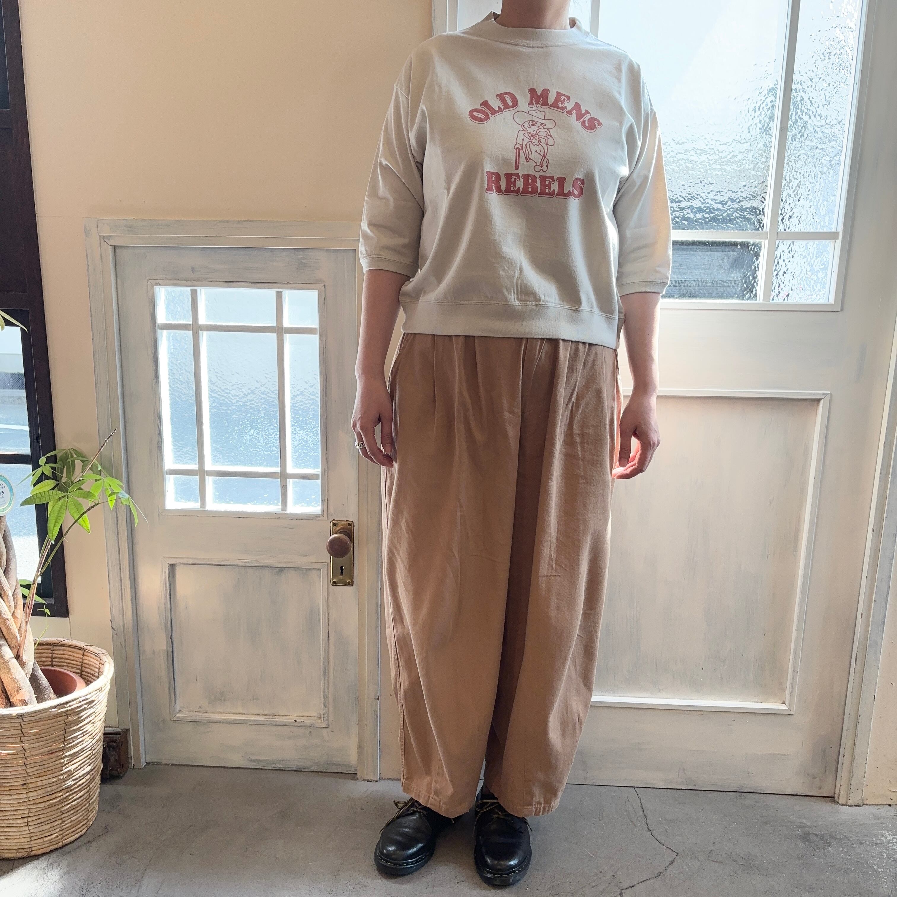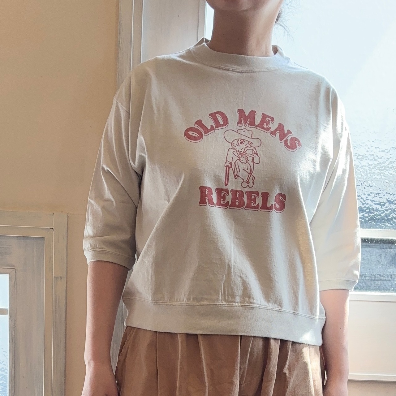 おじさんプリントが印象的な7分袖Tシャツです。