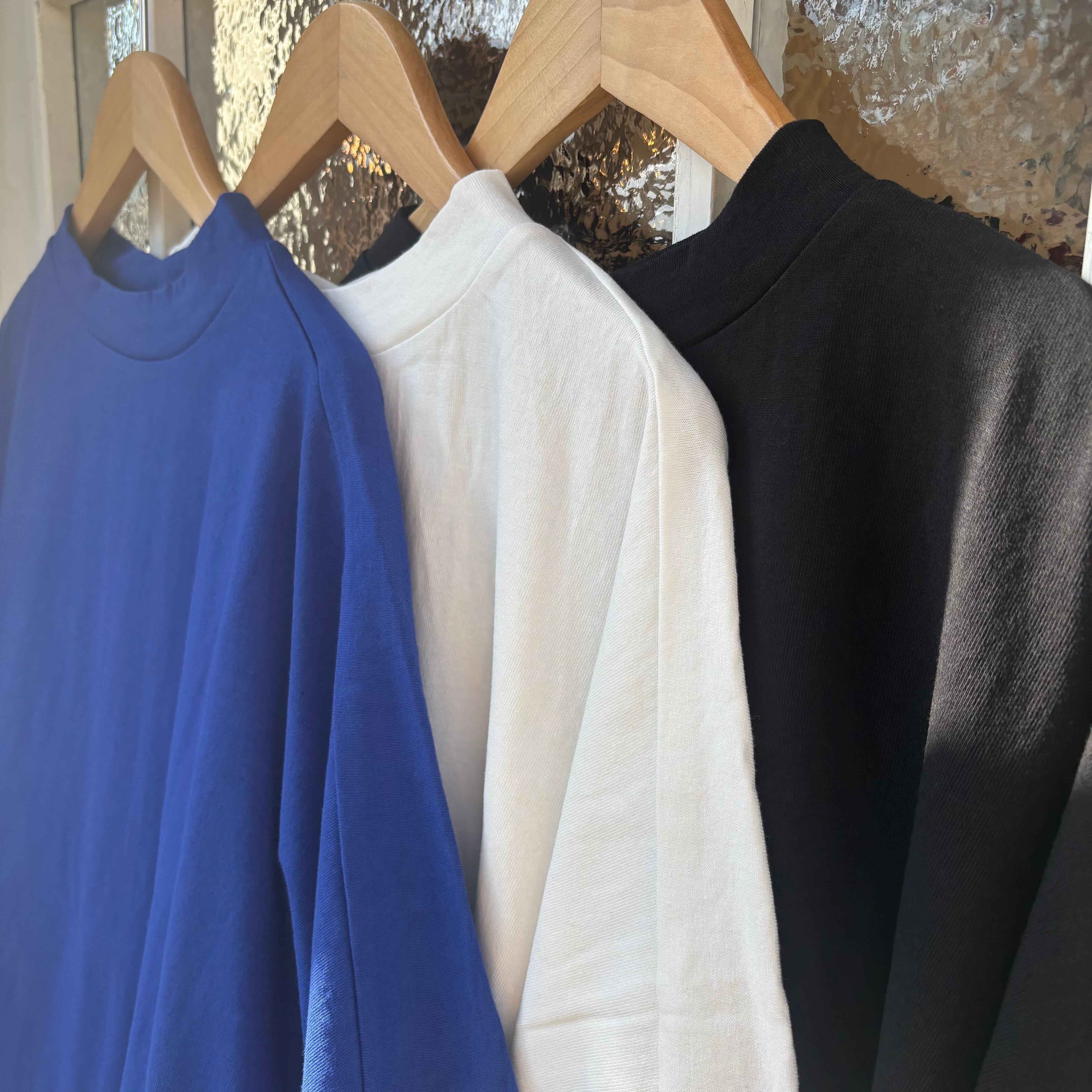 ゆったりとしたドルマンシルエットが身体のラインを自然にカバーし、モックネックが首元にさりげない立体感と上品さをプラス。一枚でもレイヤードでも使える、ワードローブに欠かせないベーシックアイテムです。
