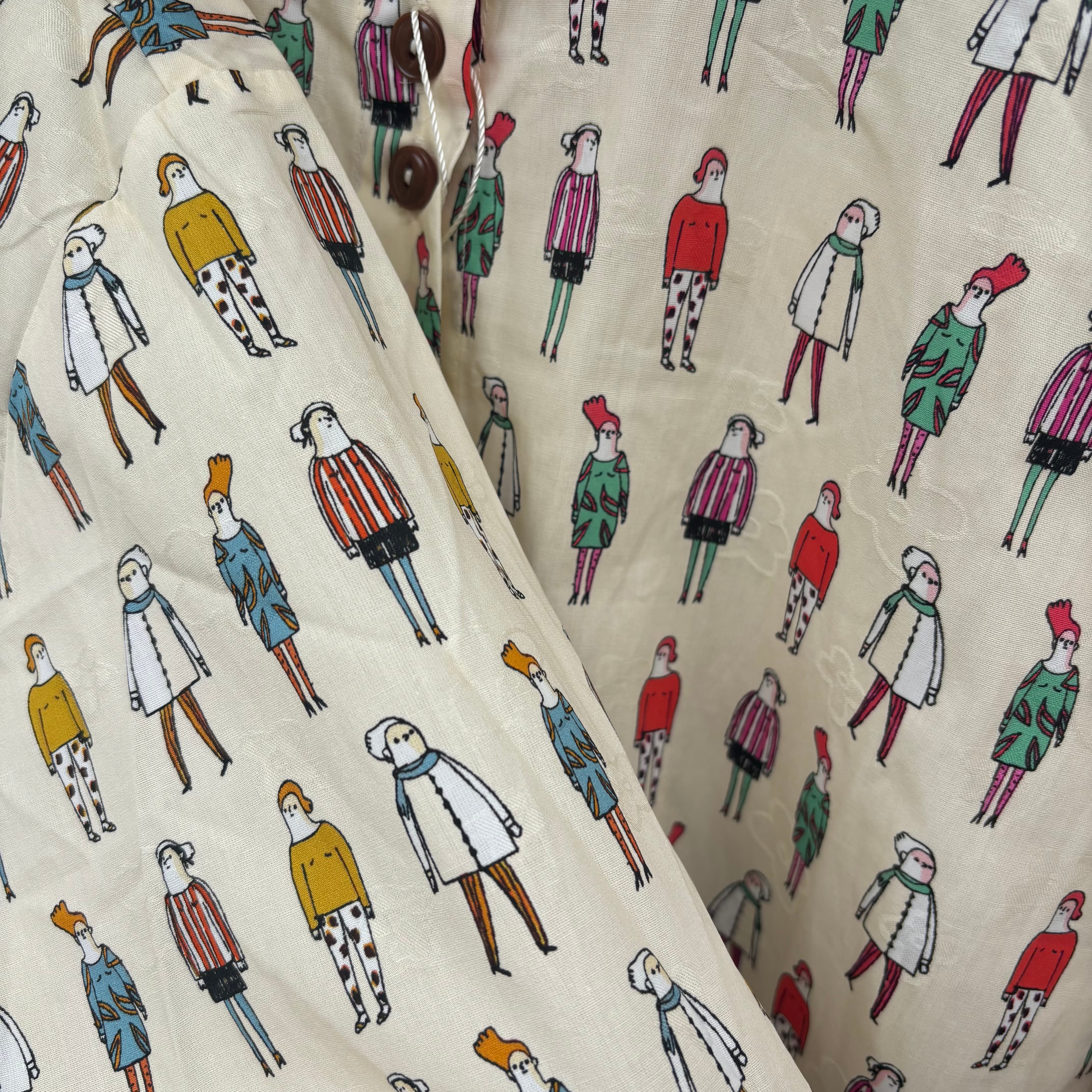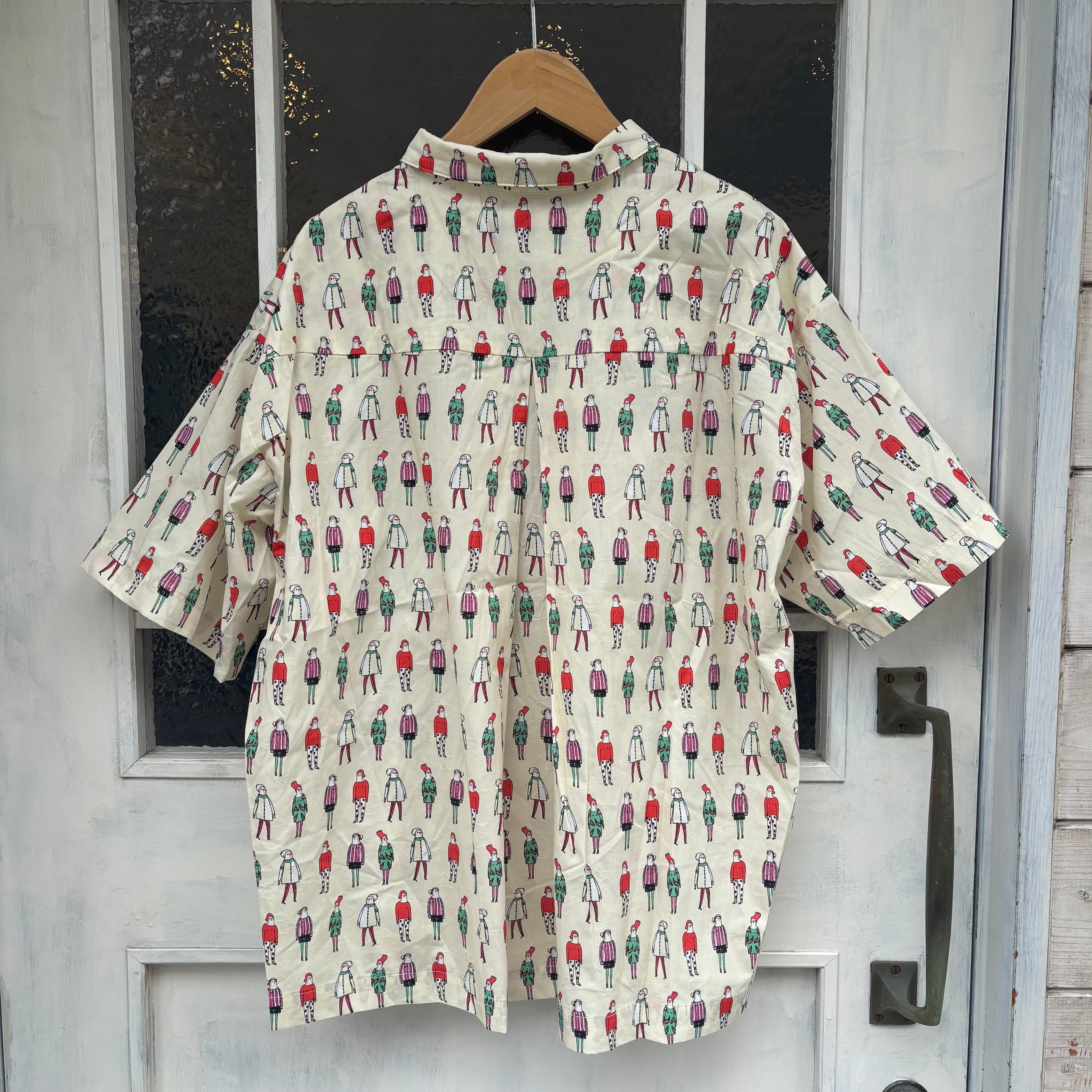 ちびえりがポイントで、お洒落が好きな人間がコミカルにプリントされ、地模様に花柄生地と盛りだくさんのシャツブラウスです。個性的なプリント◎