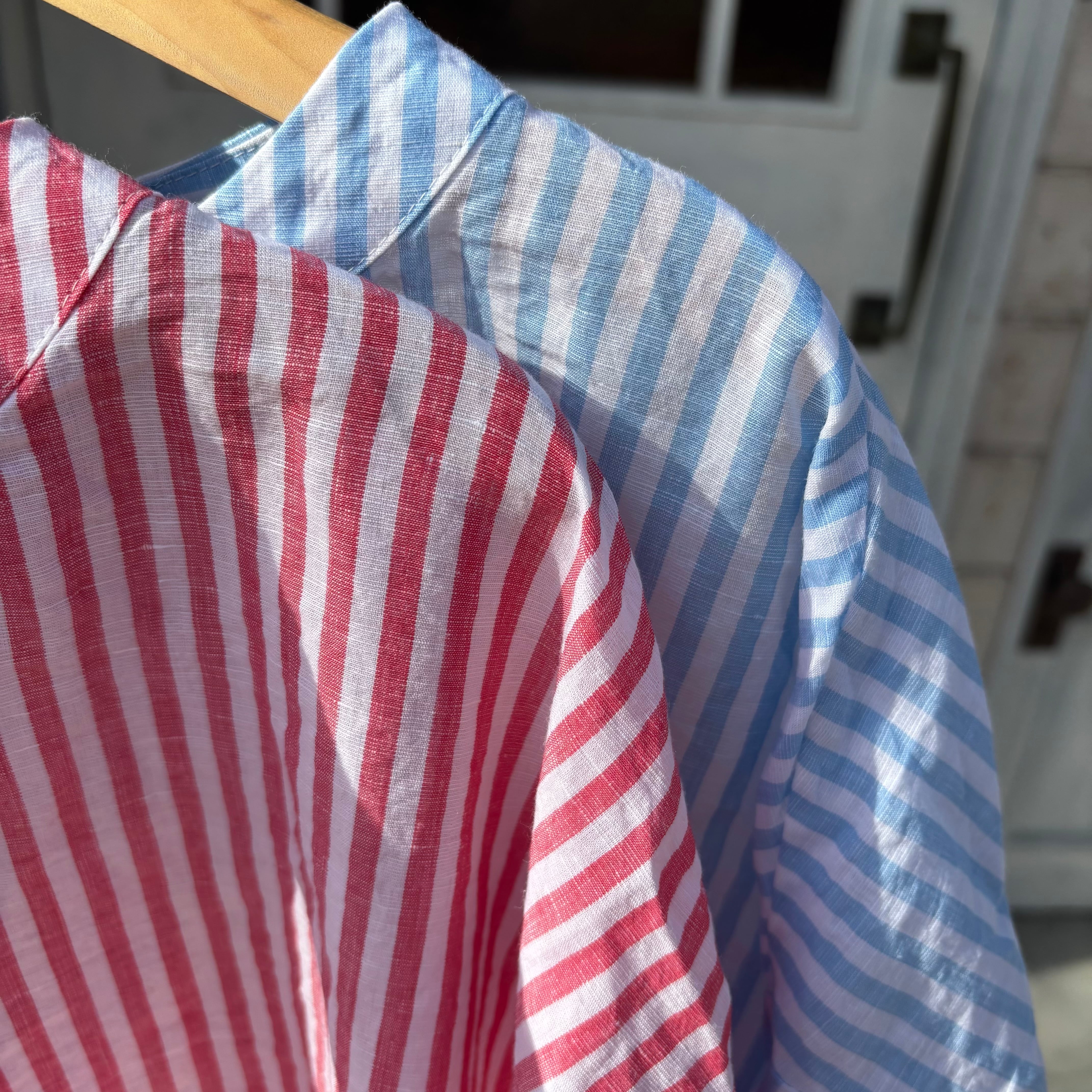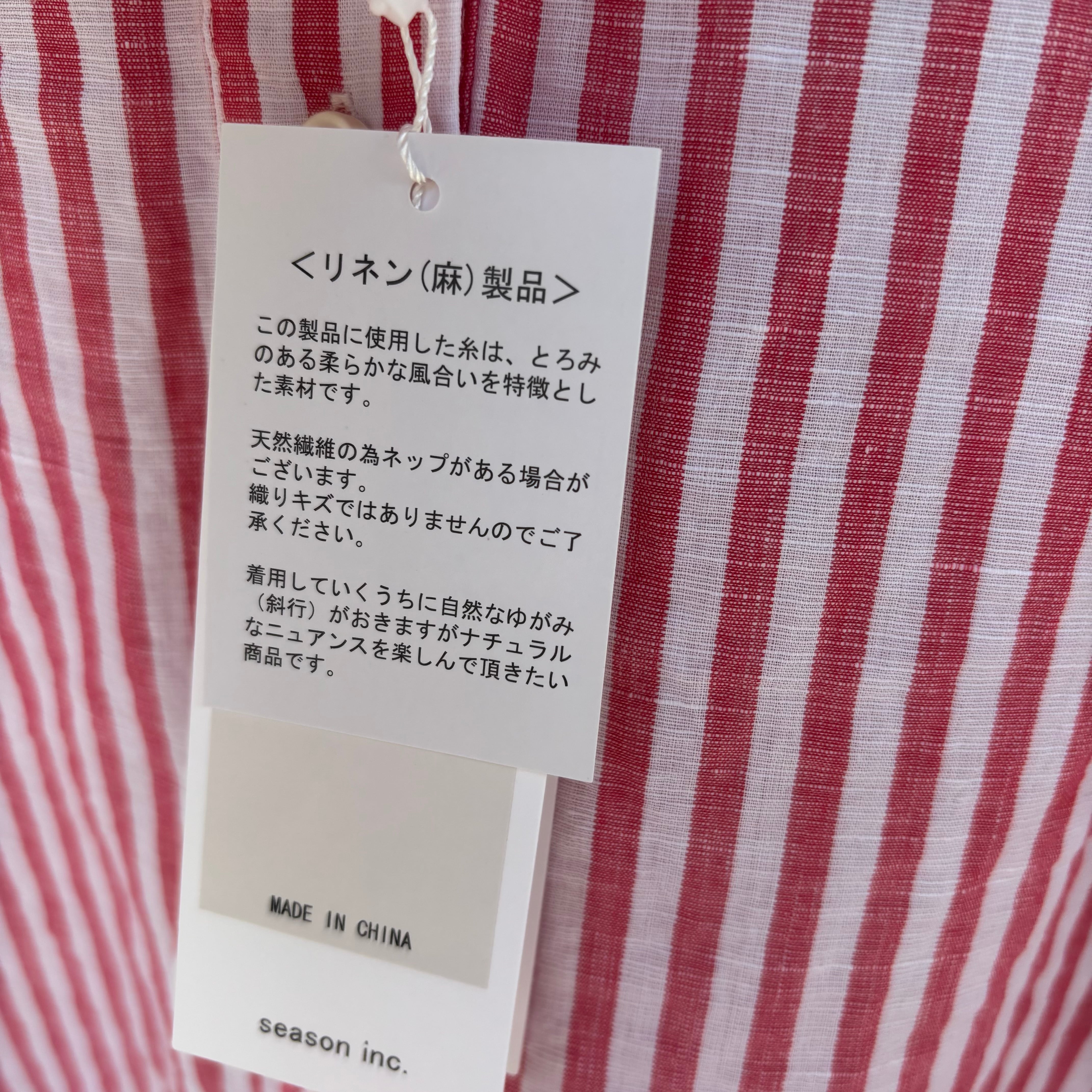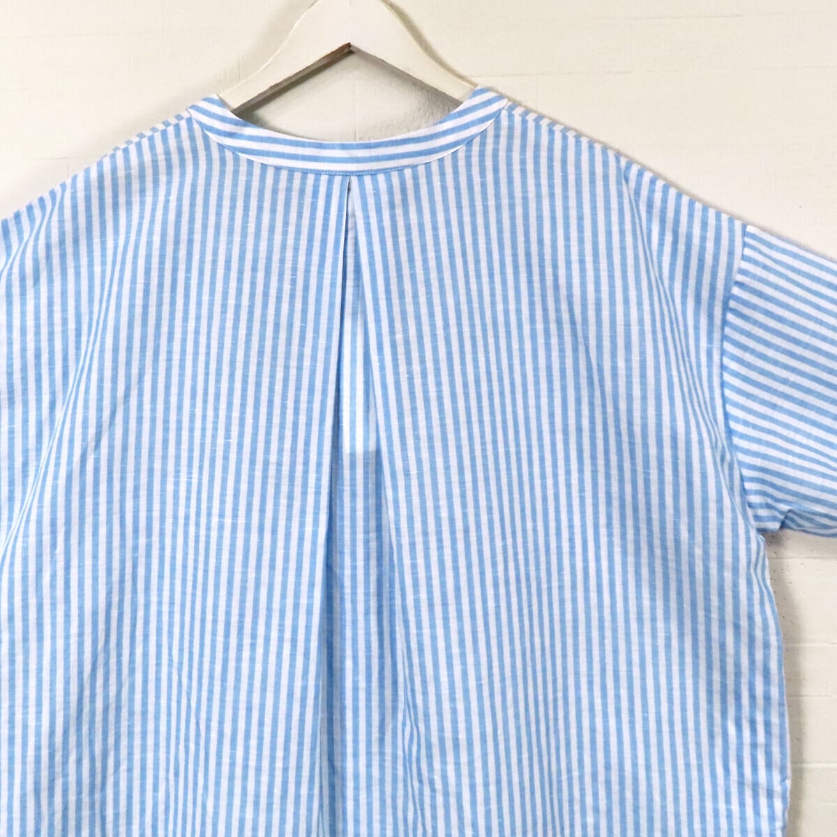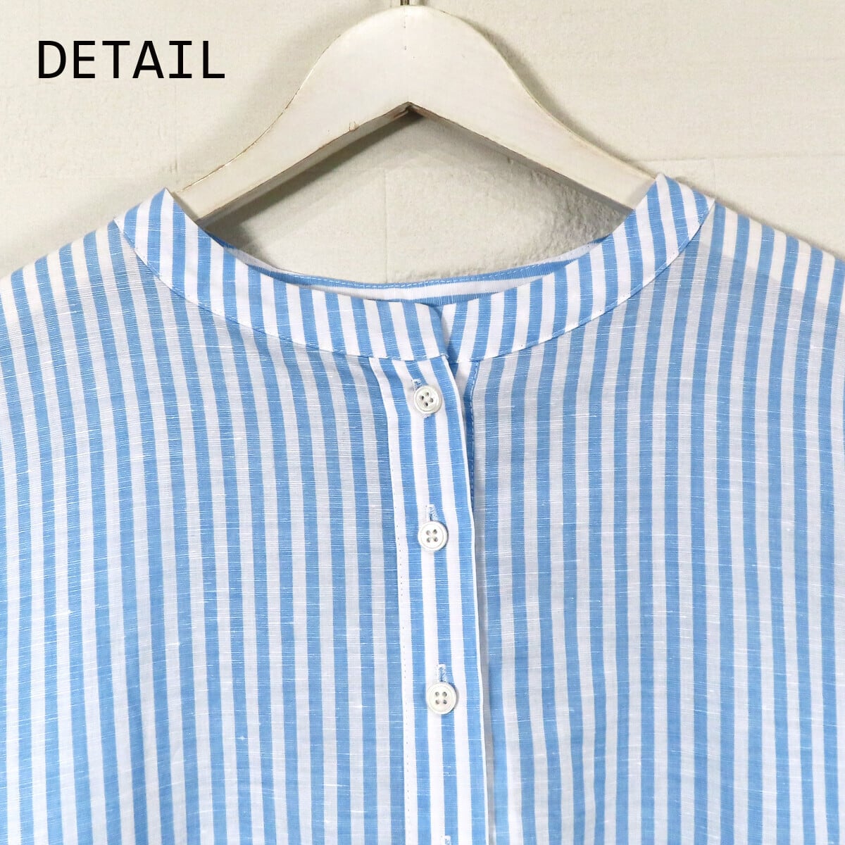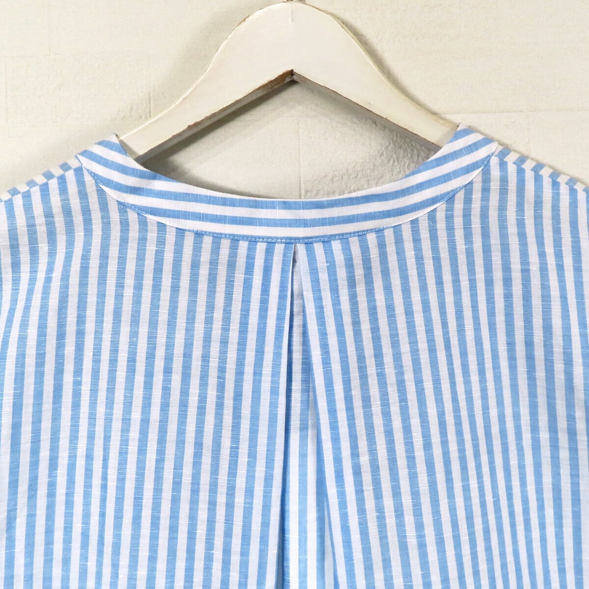 綿と麻をバランスよくブレンドした、清涼感のある先染めストライプ生地で、綿のやわらかさと麻のさらりとした風合いを併せ持った、ナチュラルな表情が魅力。麻特有のネップがあり、シワが入りやすい素材ですが、ナチュラルな風合いとしてお楽しみいただけます。