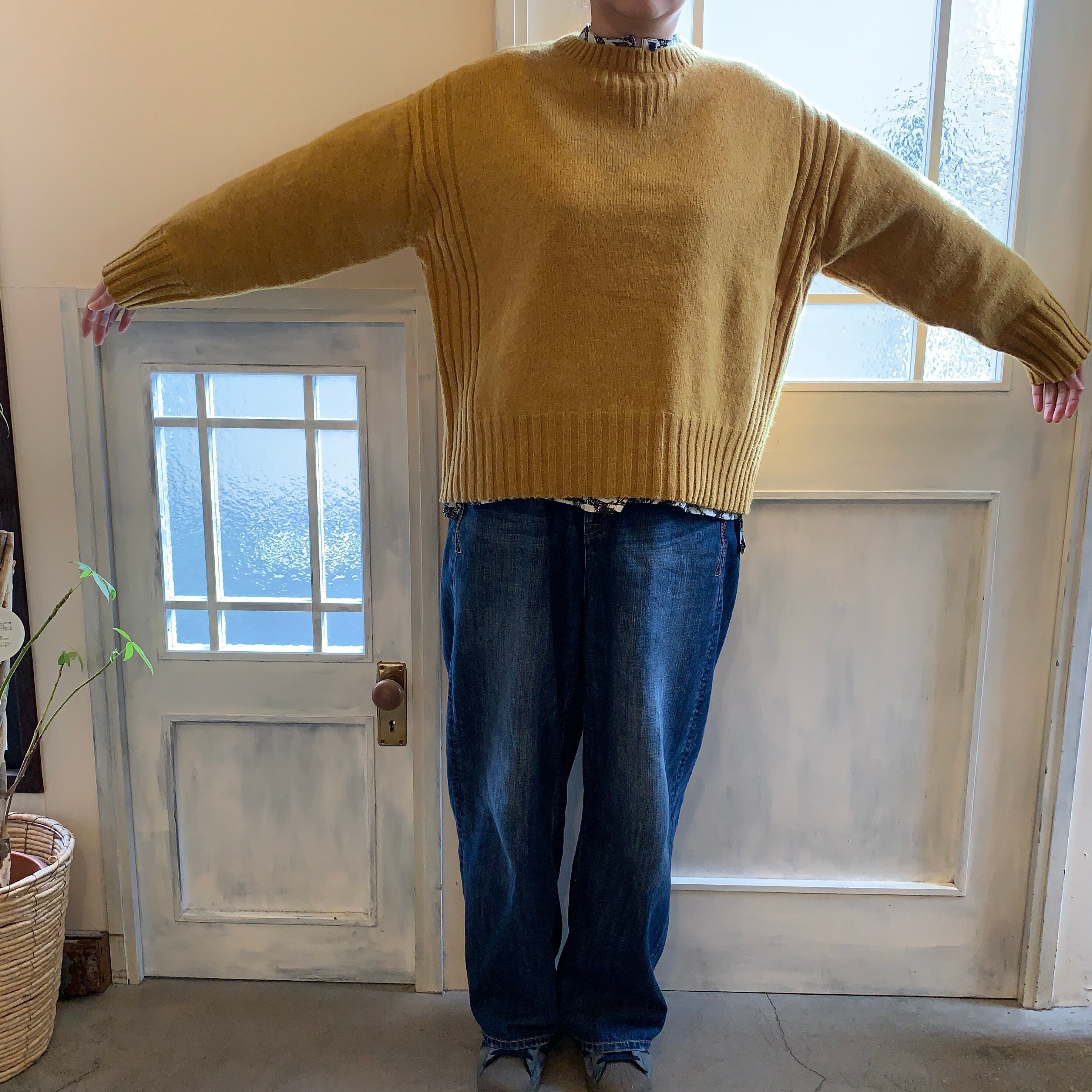 サイドや襟ぐりをガゼット風に切り替えたリブ編みもポイント。身幅を広くとった、インナーとの重ね着もできるワイドボックスシルエットです。