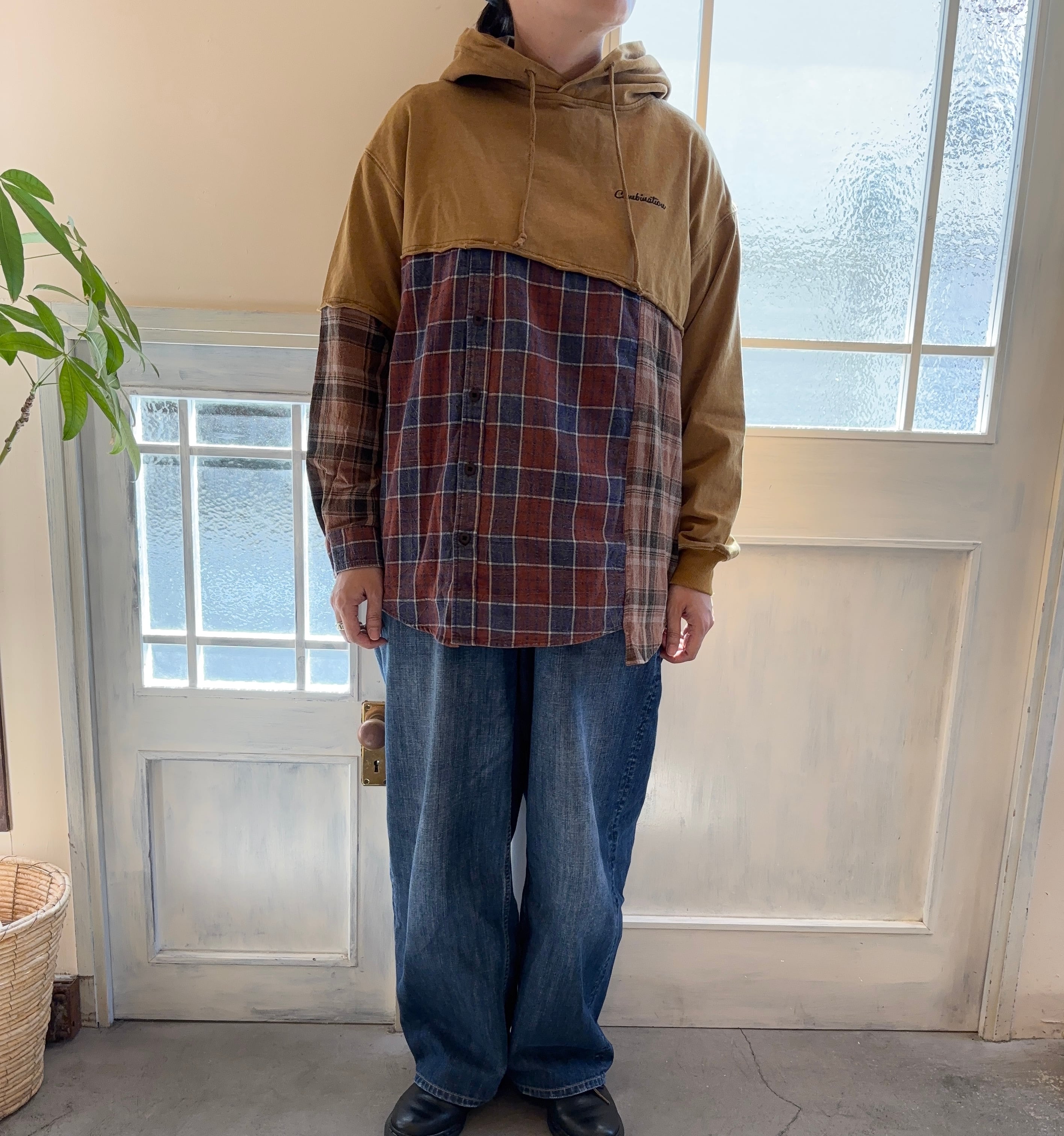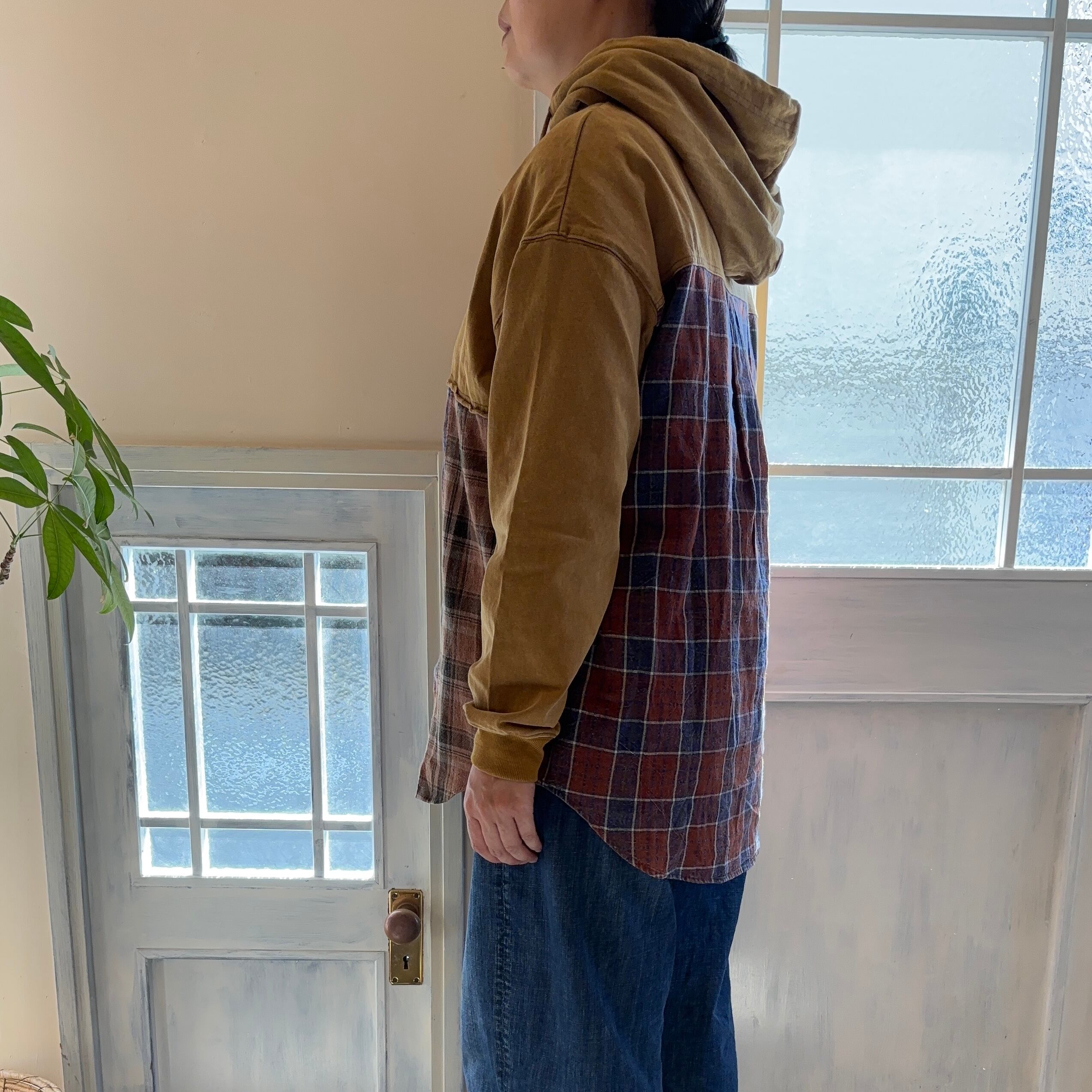 パウダー加工と異素材使いがダブルで楽しめるパーカーシャツ。あえて片方の袖だけをチェック使いにしているのも大きなポイントに。パウダー加工を施し、古着のような褪せ感のある風合いに。