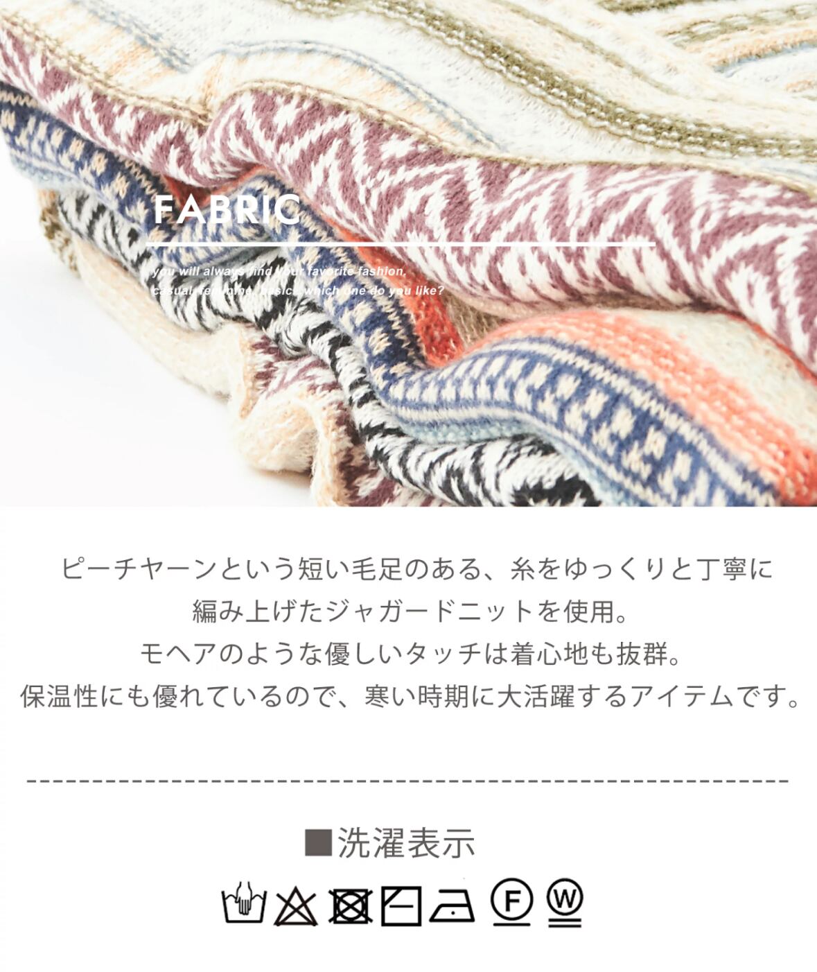 ピーチヤーンという短い毛足のある、糸をゆっくりと丁寧に編み上げたジャガードニット。モヘアのような優しいタッチは着心地も抜群。保温性にも優れているので、寒い時期に大活躍するアイテムです。